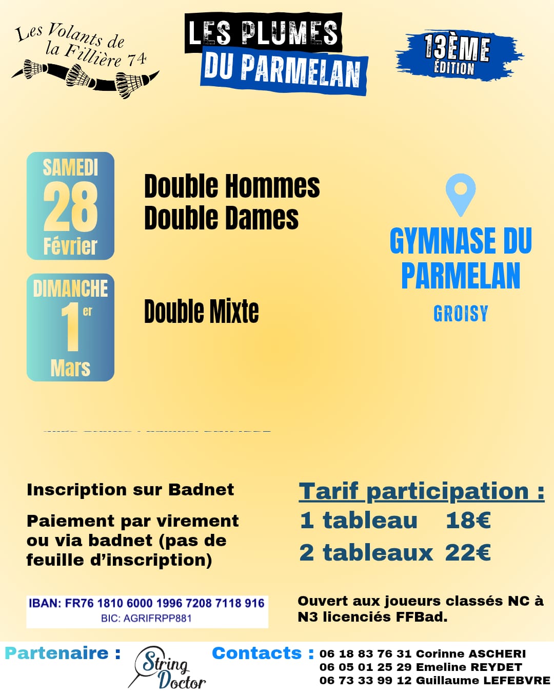 Le club Les Volants de la Fillière a le plaisir de vous inviter à la 13ème édition de son tournoi annuel les 28 février et 1er mars 2026 !